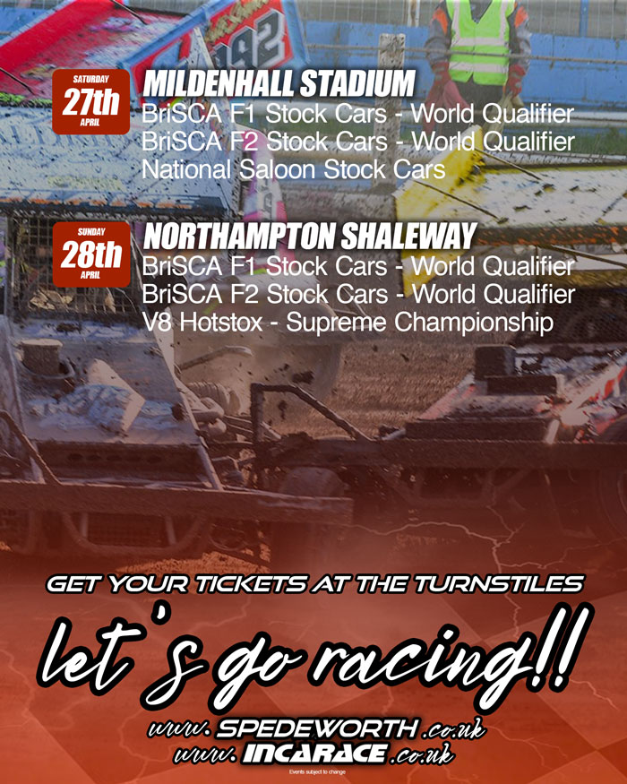 This weekend sees Suffolk’s Mildenhall Stadium and Northamptonshire’s Northampton Shaleway come alive with a Stock Car Racing spectacular as the BriSCA F1 and BriSCA F2 Stock Cars compete for World Qualifying points as the road to gold continues…
