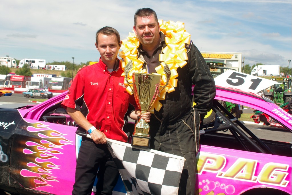 Sunday’s championship race was not just great, however, it was one of the most incredible and unpredictable races seen in the history of the National Championships. Bland led for most of the way in an ultra-close fight with 261 David Casey and Hylands, the latter finding the smallest gap and taking the lead before with a dozen laps to go he slowed with a deflating tyre and Bland pounced but this attack sent Hylands and Casey into the wall while contact from the chasing 76 Adam Maxwell spun Bland and in seconds the entire top three had gone. This left Maxwell ahead with almost all the pre-meeting favourites out on the infield and he led off but with three laps to go his gearbox failed and it was 940 Gary Woolsey who took the win, holding off 996 Stewart Doak to become the first second-generation driver to win the National Championship. Teenager 199 Jamie McCurdy took third and only ten cars went the distance, in a race that will be remember as the one seemingly no-one wanted to win! Woolsey would celebrate in style later in the afternoon too, leading from the front of the drawn grid to win the NHRPA Championship and complete a wonderful double.