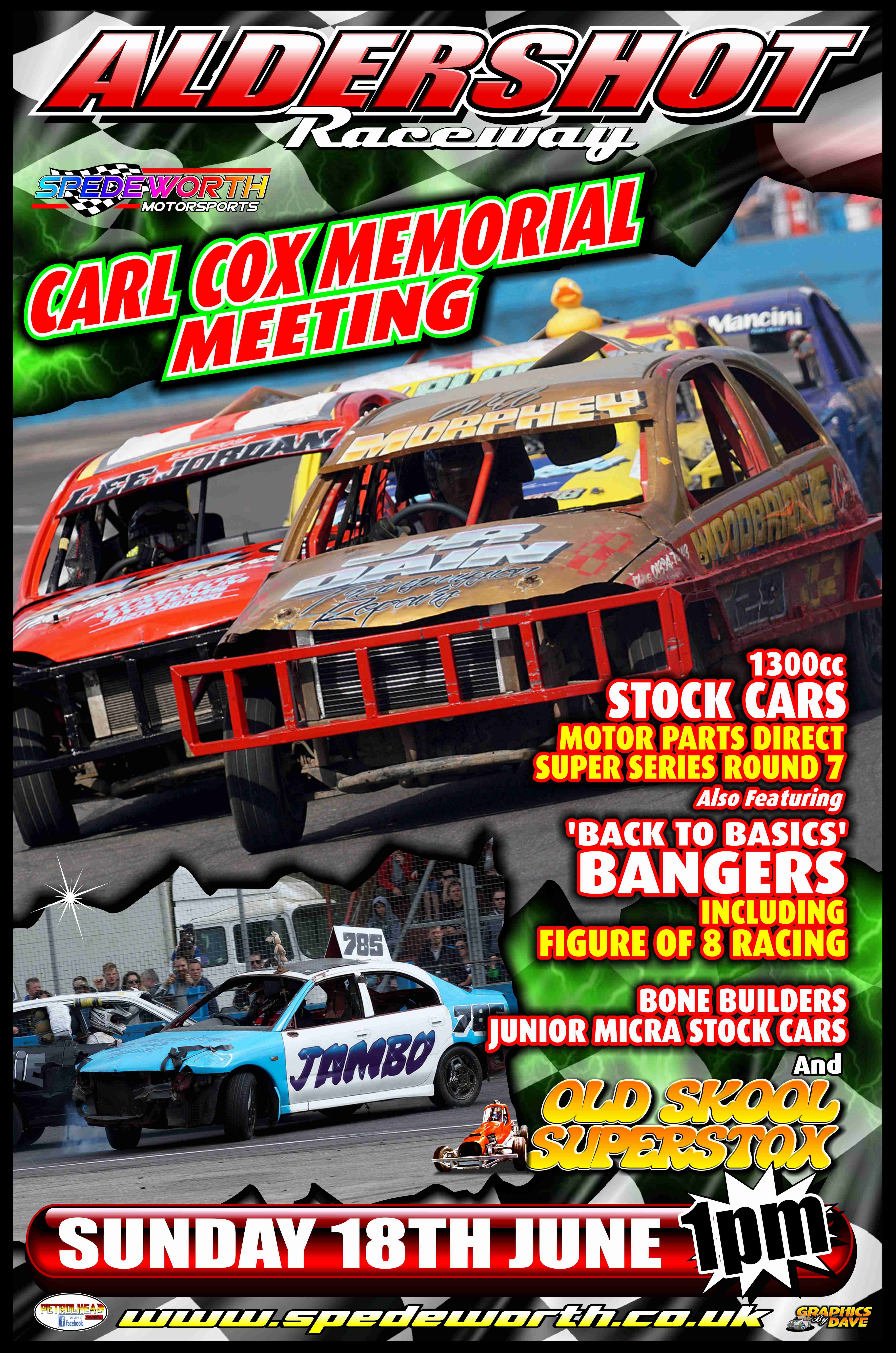 Finally, finishing a busy weekend off we have another great meeting at Aldershot as we present the Carl Cox Memorial Meeting featuring 1300 Stock Cars in their Motors Parts direct Super Series Round 7, ‘Back to Basics’ Bangers including Figure of 8 Racing, the Bone Builders Junior Micra Stock Cars and to complete the line-up we have the Aldershot debut of OldSkool Superstox bringing a touch of glorious nostalgia to Aldershot with the action getting underway at 1:00PM.