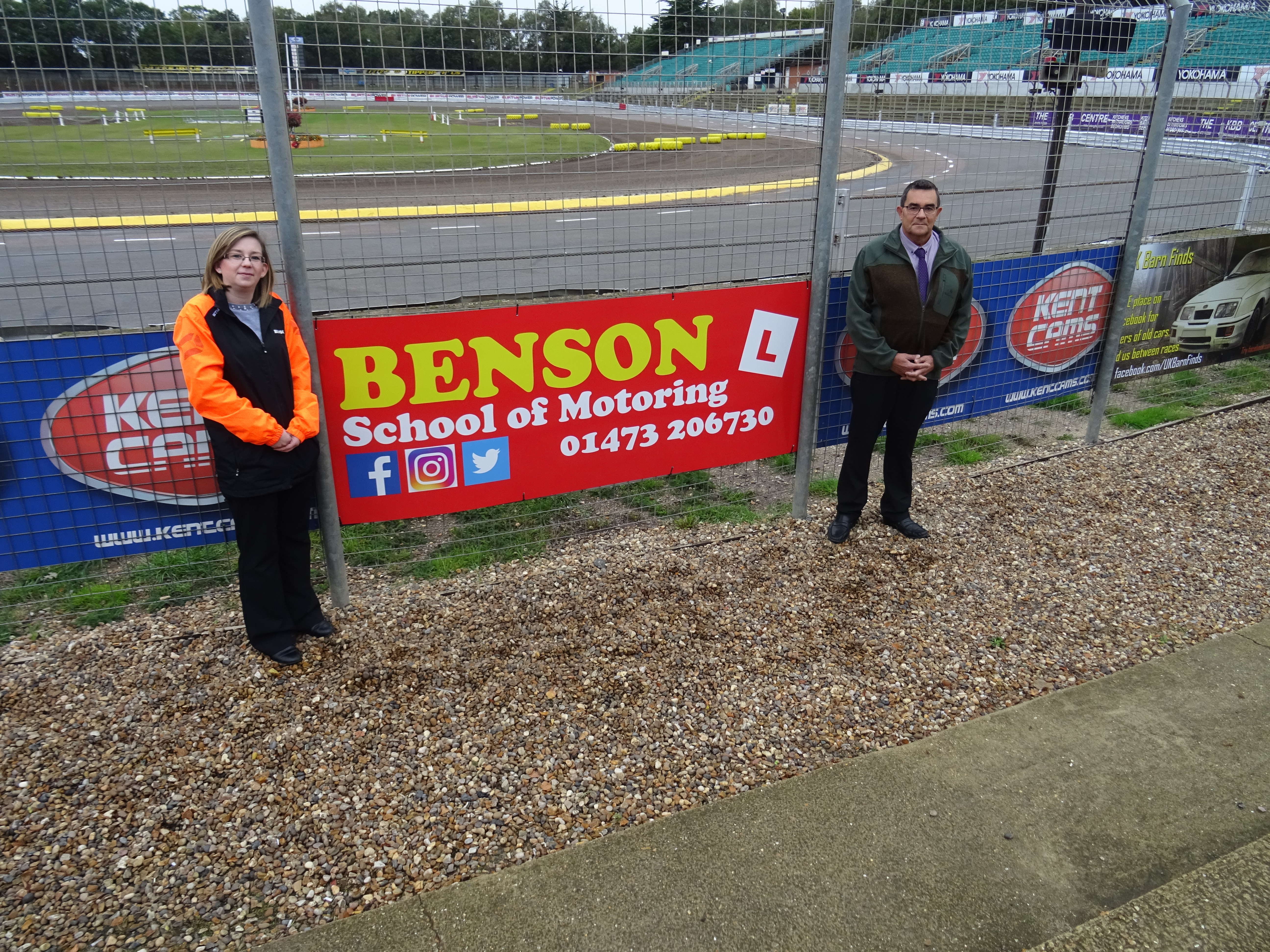 Benson instructors Kirsty and Terry are pictured with their new catch fencing sign at Foxhall Stadium and taking to the grid!