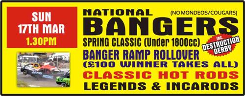 Sunday 17th March 2013 brings the Spring Classic meeting back to Hednesford Hills Raceway (1.30pm Start Time) this year for the 1800cc National Bangers (No Mondeos).