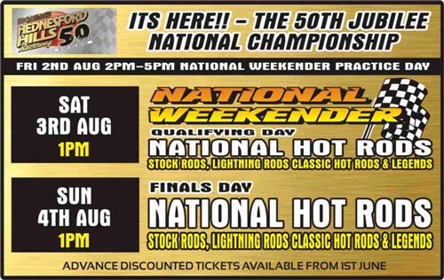 Advance tickets are now available for the 50th National Championship Weekend event at Hednesford Hills Raceway on Friday 2nd/Saturday 3rd and Sunday 4th August.