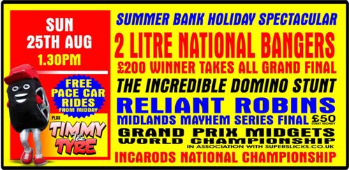 We have a Winner Takes All 2 Litre National Banger Final, and the Grand Prix Midgets will be out in force competing for their 2013 WORLD CHAMPIONSHIP crown.