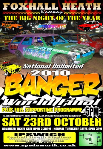 Banger World Final night is not just about winning the biggest title in Banger Racing, this is the night when the drivers prepare their cars to the very highest standards with metallic paintwork, expensive airbrushed signs and murals. Many race fans arrive early as the pits resembles a motor show rather than a Banger Race meeting and promoters Spedeworth advise race goers to be at Foxhall in good time and to follow the direction signs if approaching the Stadium from the A12 at Martlesham.