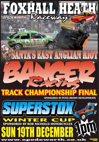 The Bangers always put on a great show at Foxhall and this end of season Grand Final of the Ipswich Banger Championship looks like ensuring that the 2010 season goes out with a bang. Ipswich driver Dave Canham has already got the title in the bag with Martlesham garage owner Simon Berry in second place, Daniel Harvey will want to challenge Berry for the runners up spot and he in turn will be looking over his shoulder for Kevin Buckley and Simon Rose who are in 4th and 5th places. Its in this top five that the important places are up for grabs and a podium place looks impossible for anyone else in the Championship which has seen 48 drivers scoring points over the season. Some of the established Ipswich Banger drivers are a little lower down in the points this year than usual, “this just goes to show what a keenly fought series this is every year” said Spedeworth Racing Manager Christer Earrey “once again its thanks to Peter Brown for his support with the Ipswich series, it has been very close in the top 5” he added.