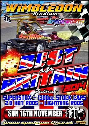 Spedeworth and Incarace would like to remind everyone that this coming Sunday, (16th November) that Wimbledon Stadium hosts the annual Best of Britain event. We have a night of top racing for you with the 1300 Stockcars, 2.0 Hot Rods, Superstox and Lightning Rods all battling it out to become the Best in Britain! All 4 formulas always make for great watching and this Sunday should be no different and we are very much looking forward to another night of top racing under the floodlights at Plough Lane, Wimbledon.