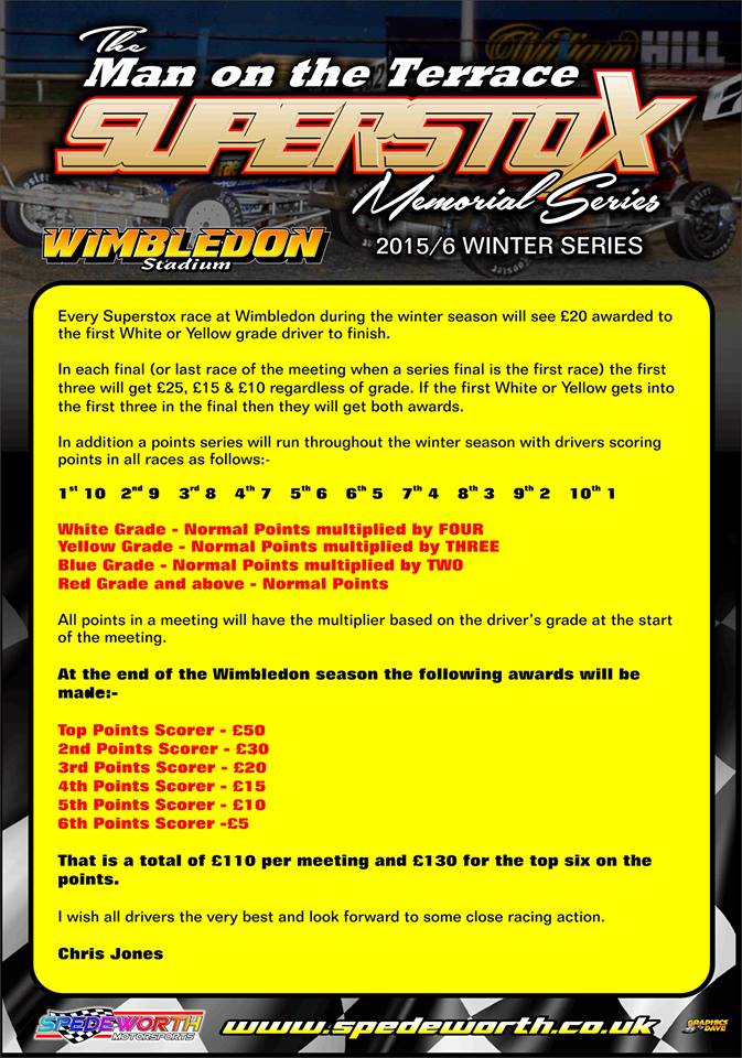 Round one of the Brand New Superstox Man on the Terrace Memorial Series took place at Wimbledon Stadium on Sunday, points are as follows as compiled by series sponsor, Chris Jones;