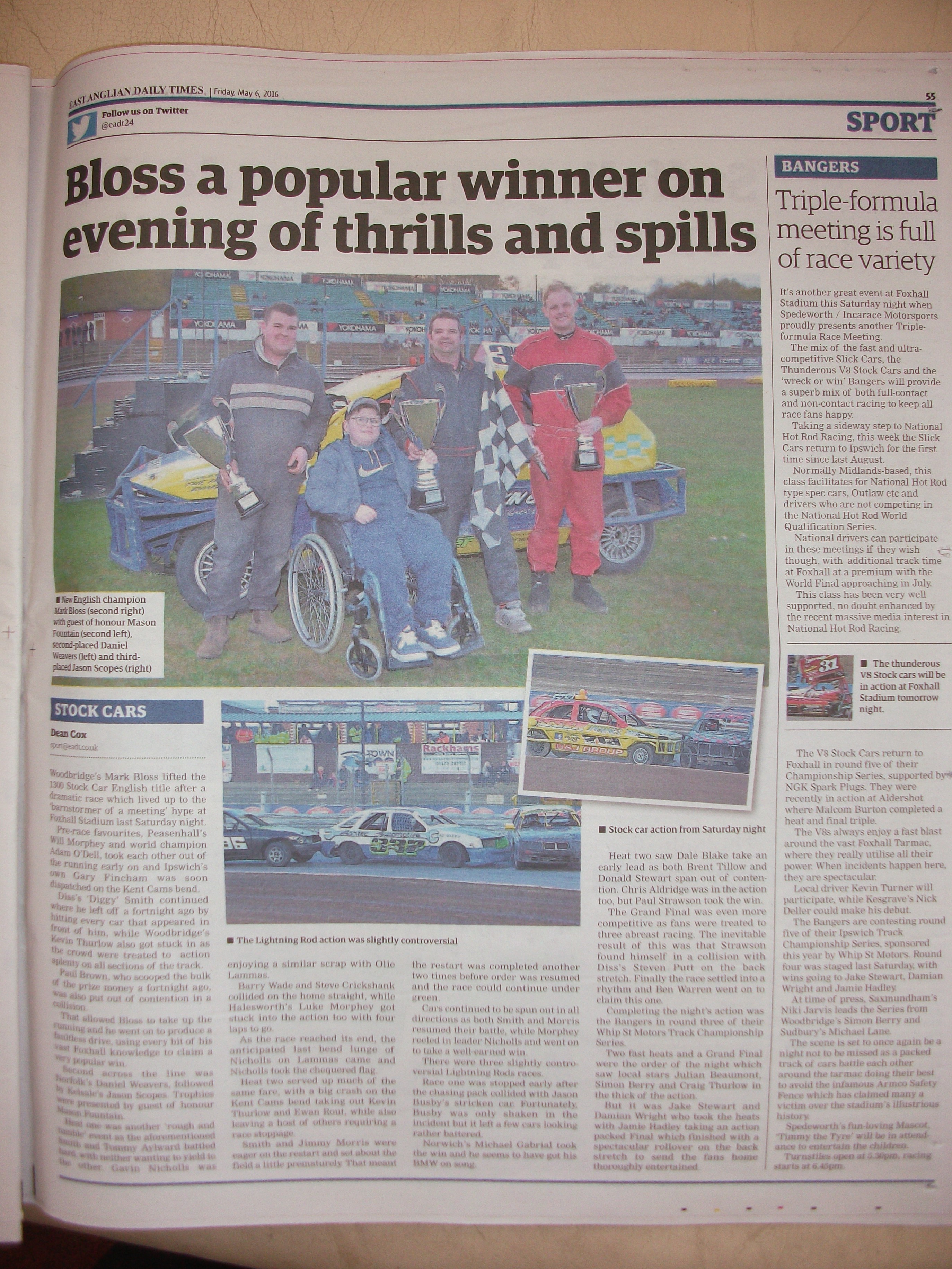 East Anglian Race Fans, don't forget to pick up your copy of the East Anglian Daily Times and Ipswich Star today for a Preview on this coming Saturday Nights Triple Formula Meeting and the report on last weeks 1300 Stock Car English Championship Meeting at Foxhall Stadium, Ipswich.