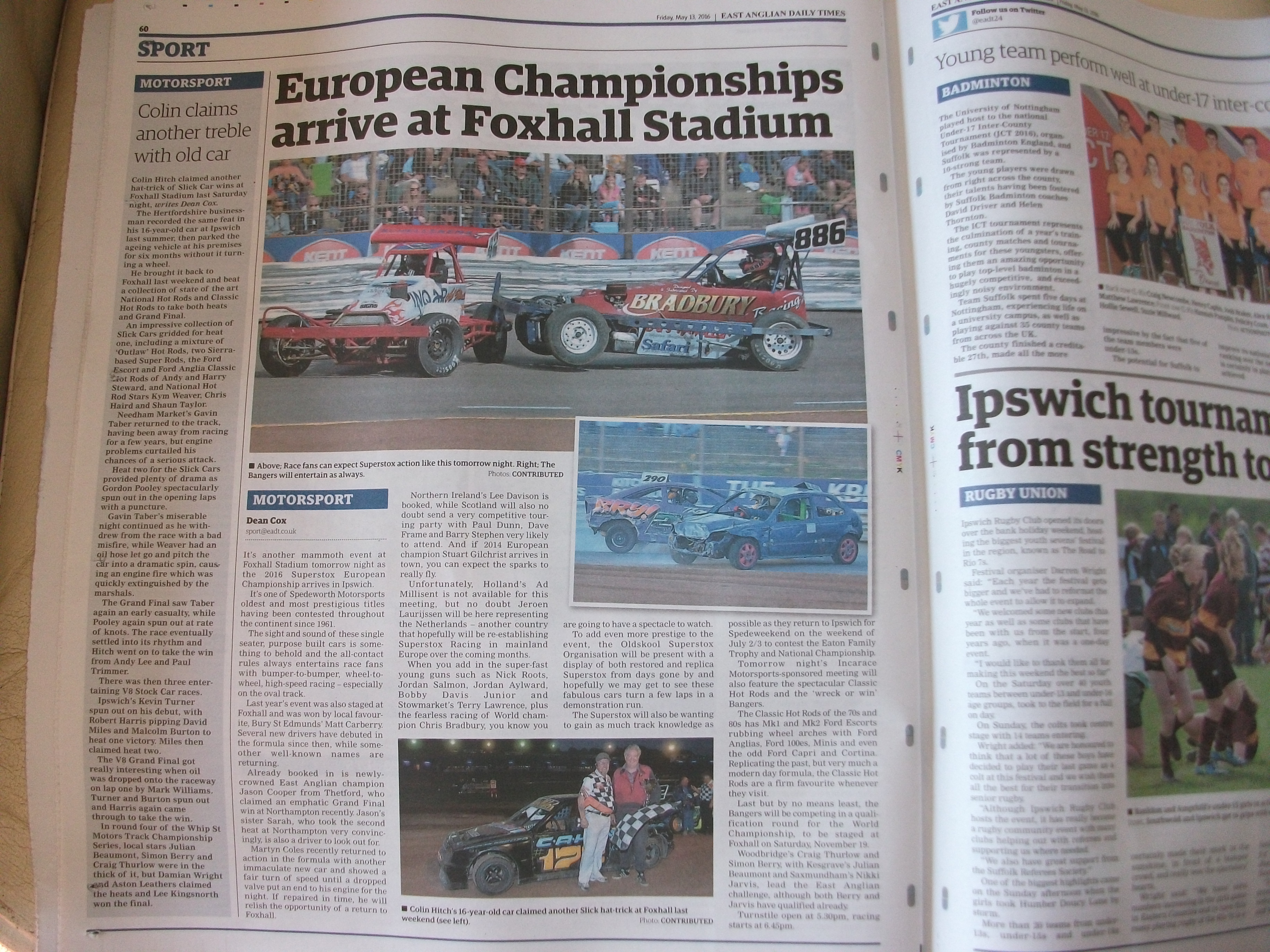 East Anglian Race Fans, don't forget to pick up your copy of the East Anglian Daily Times and Ipswich Star today for a Preview on this coming Saturday Nights Superstox European Championship Meeting and the report on last weeks Triple Formula Meeting at Foxhall Stadium, Ipswich.
