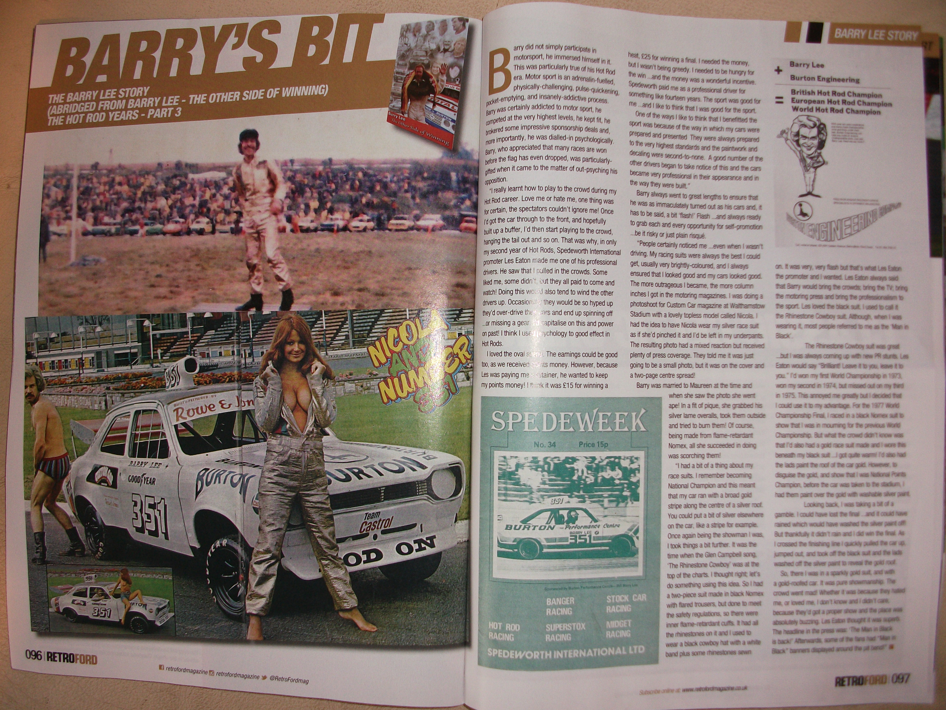 There’s also extracts from Barry Lee’s latest book, ‘The other side of winning’ – including a very rare colour publicity pic of Barry and Custom Car Magazines Promotional Girl Nicola from 1974!