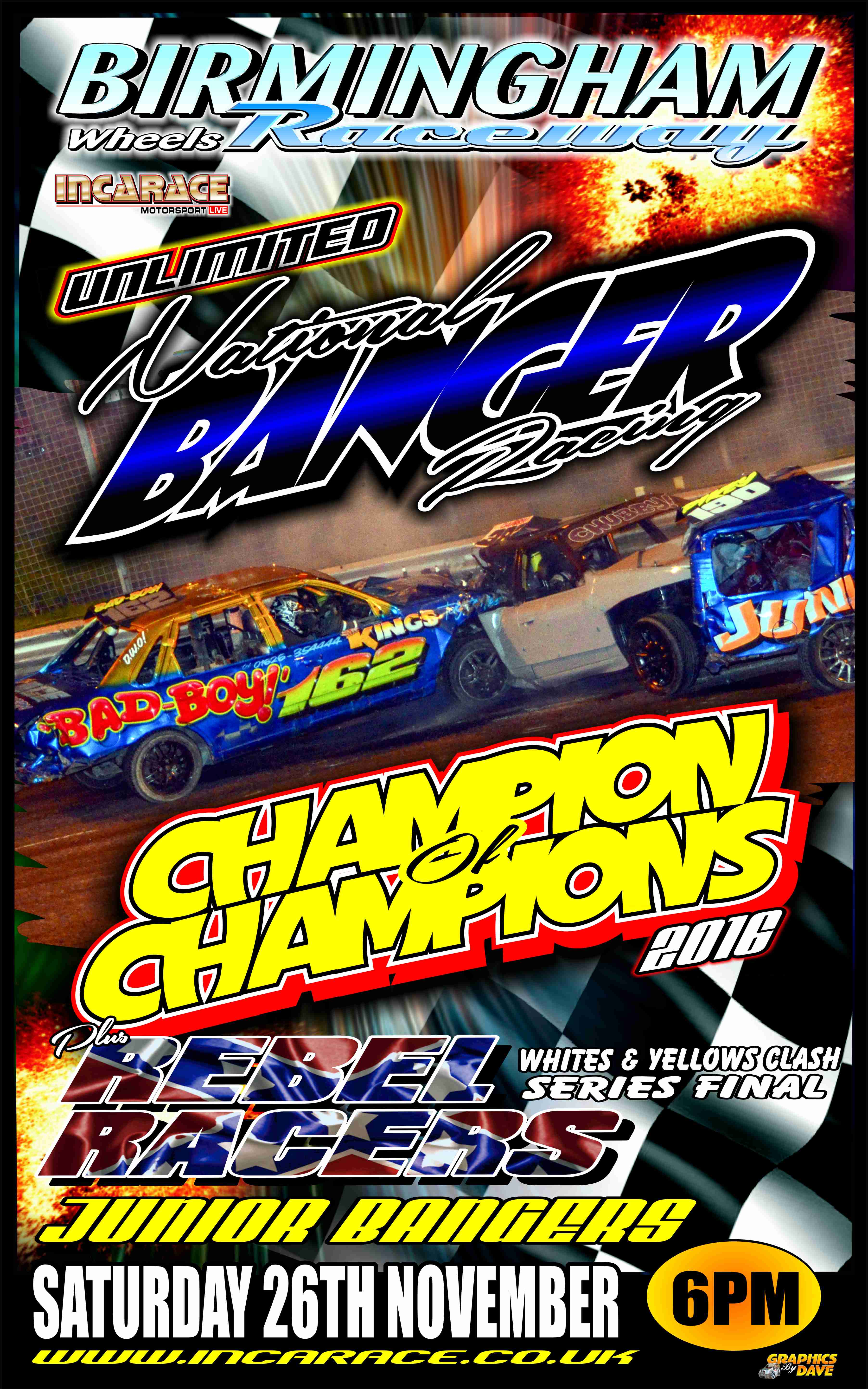 Don’t forget this weekend Race Action is at Birmingham Wheels Raceway on Saturday with their 2016 Season Finale` the annual and legendary National Unlimited Bangers Champion of Champions Meeting with Junior Bangers in Support at 6:00pm.