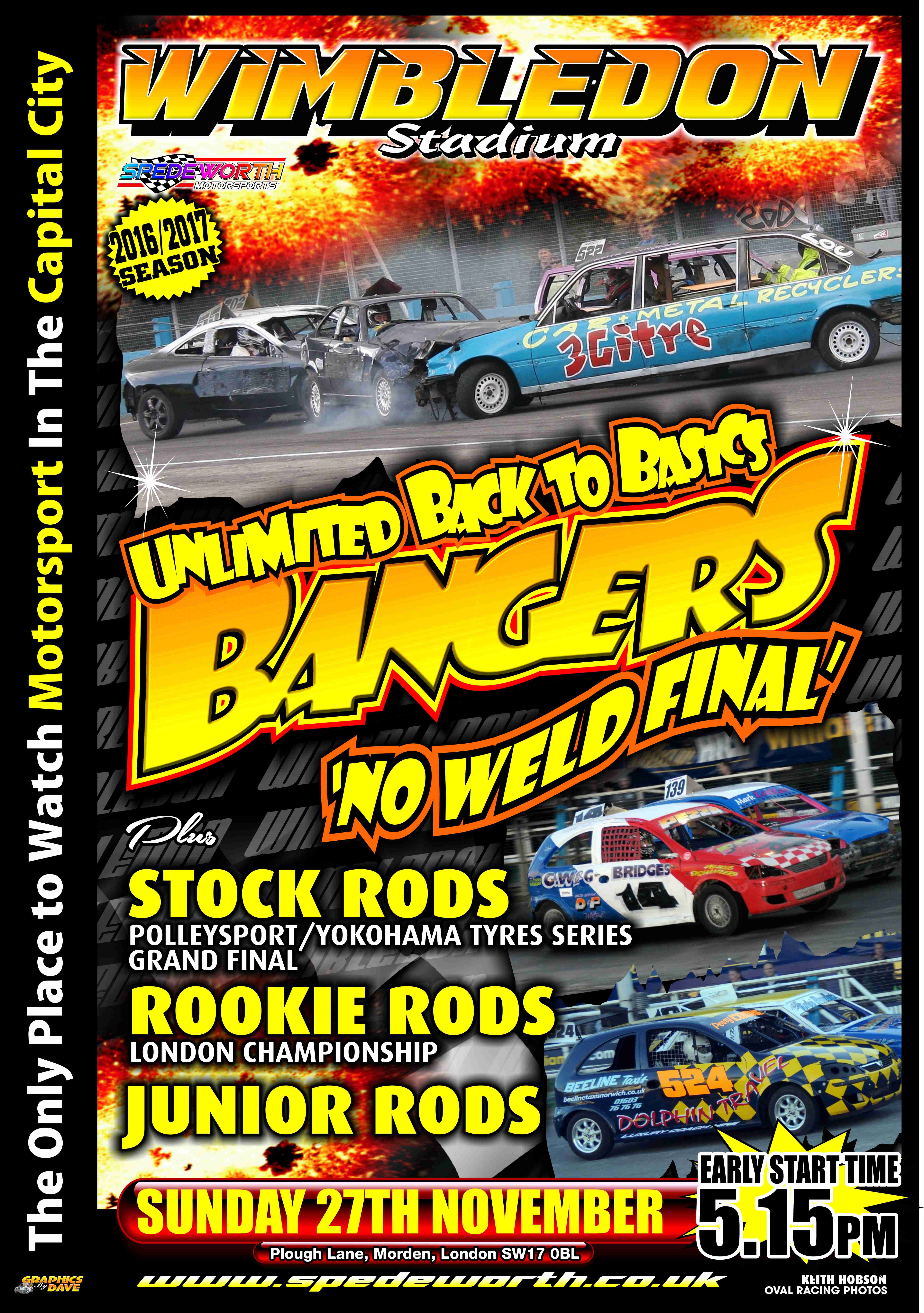 Sunday, we see the rescheduled National Bangers Micro Madness and ORCi Ministox Meeting at Mildenhall with a 2:00pm start and then action at Wimbledon Stadium for Bangers, Back to Basics, Rookie Rods London Championship, Junior Rods and Stock Rods competing for their 2016 Polleysport / Yokohama Series Grand Final starting at 5:15pm.