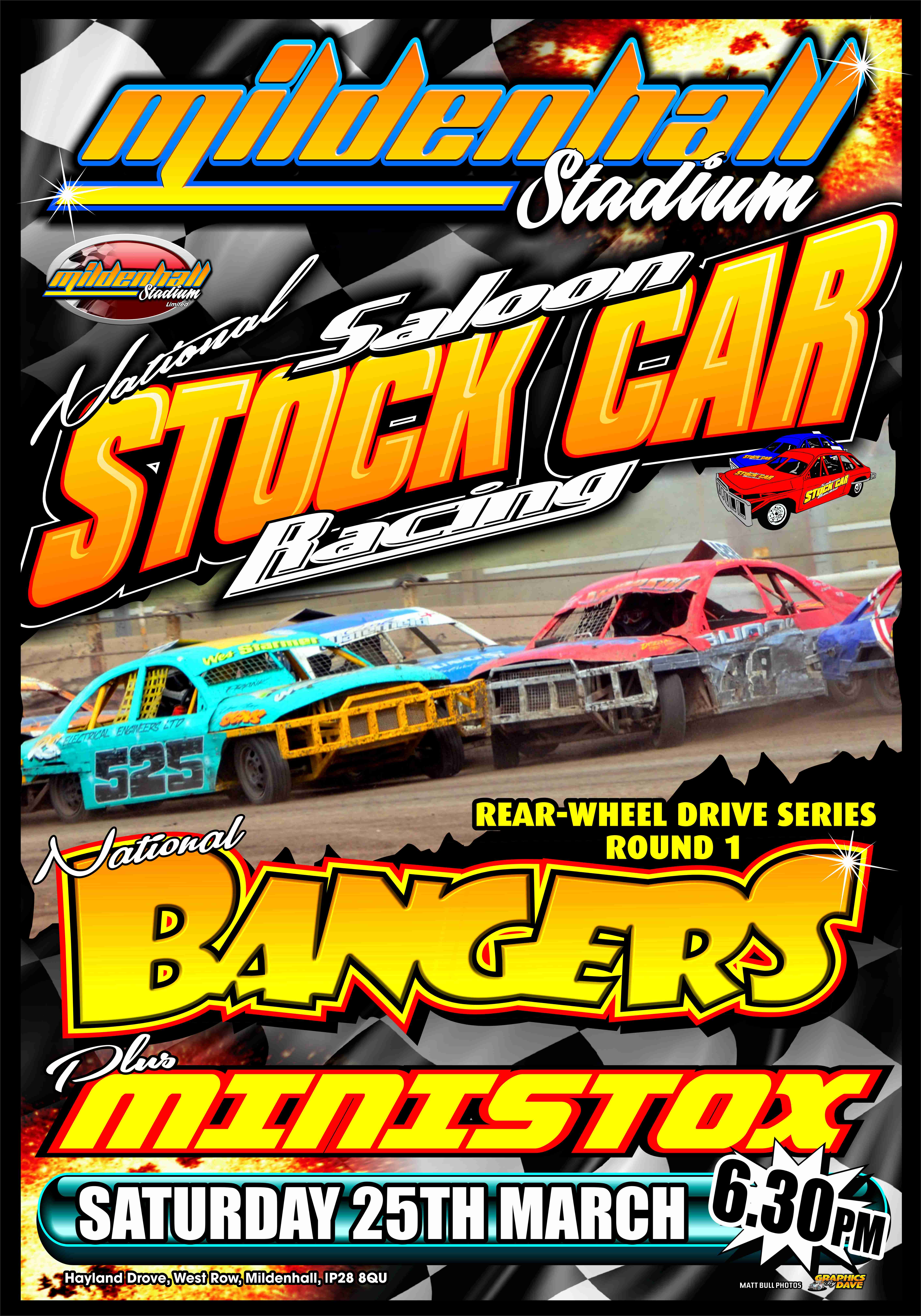 At Mildenhall Stadium, we have the fantastic National Saloon Stock Cars, National Bangers competing for their Rear wheel Drive series Round 1 and ORCi Ministox. This promises to be a ‘Barnstormer of a meeting’ and a ‘good old stock car night’ starting at 6:30PM.