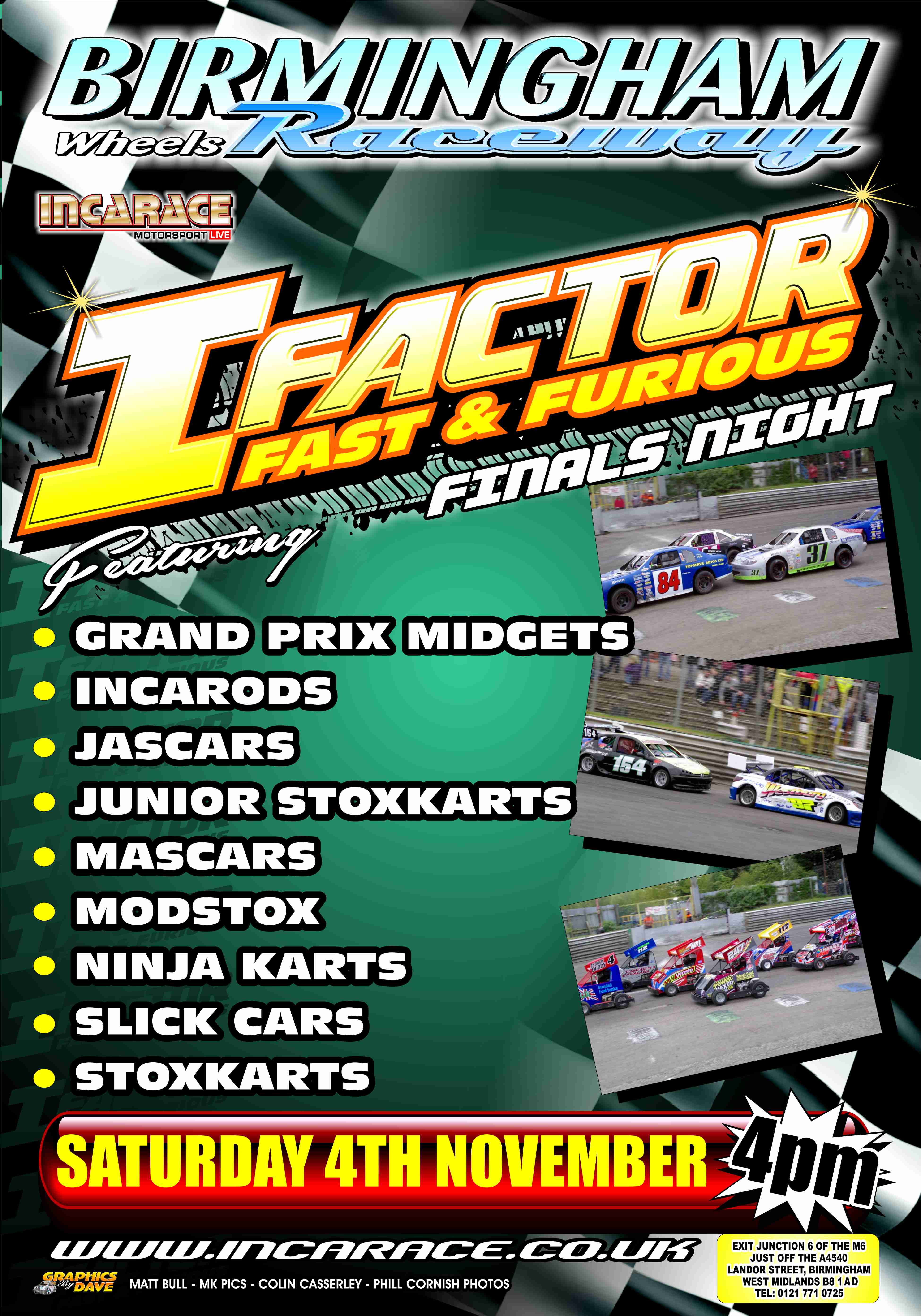 Don’t forget this weekend’s Gala Meeting Race Action kicks off on Saturday 4th November at Birmingham Wheels Raceway for the I Factor Fast and Furious Finals Night to bring a Multi – Formula Mammoth meeting to the City. It all starts at 4:00PM to make it a fantastic night of racing in the Midlands.