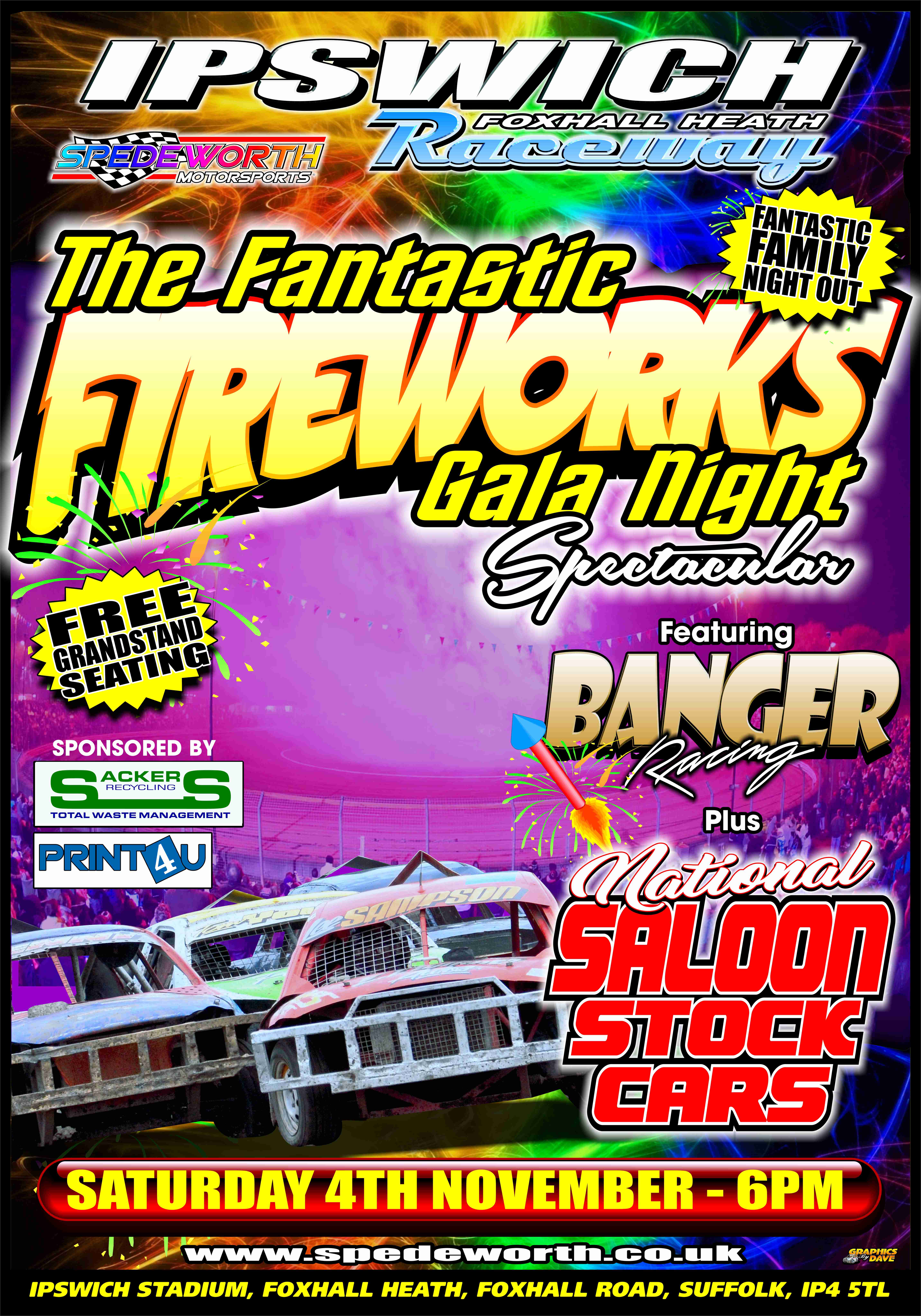 At Foxhall Stadium, Ipswich it’s the annual Gala Night meeting with a superb entry of 104 Bangers and 32 National Saloon Stock Cars, plus of course one of our famous Firework Displays. Race Fans please note, Advance Ticket Turnstiles will open at 4:00PM with Regular Turnstiles opening at 4:30PM.