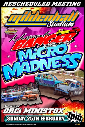 Mildenhall Stadium are pleased to announce that the Micro Madness National Banger meeting which was due to take place on Sunday 28th January 2018 has now being rescheduled to run on Sunday 25th February 2018 with a 1pm start time.