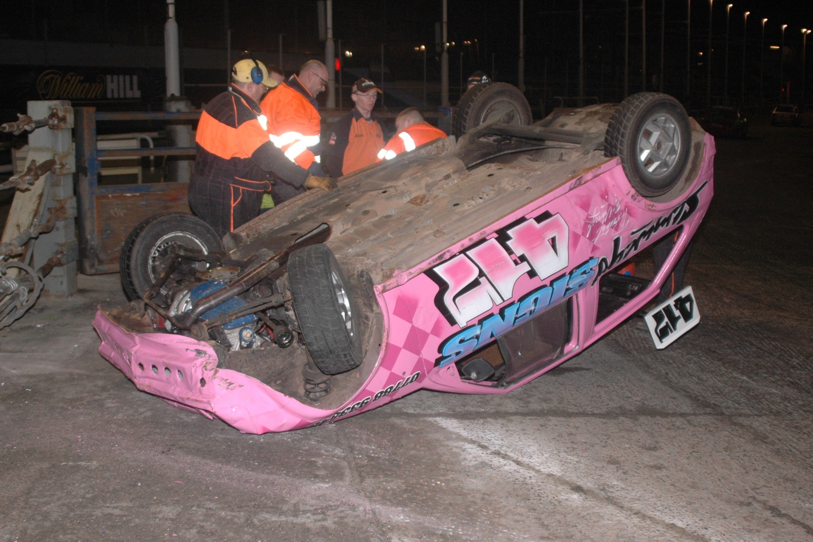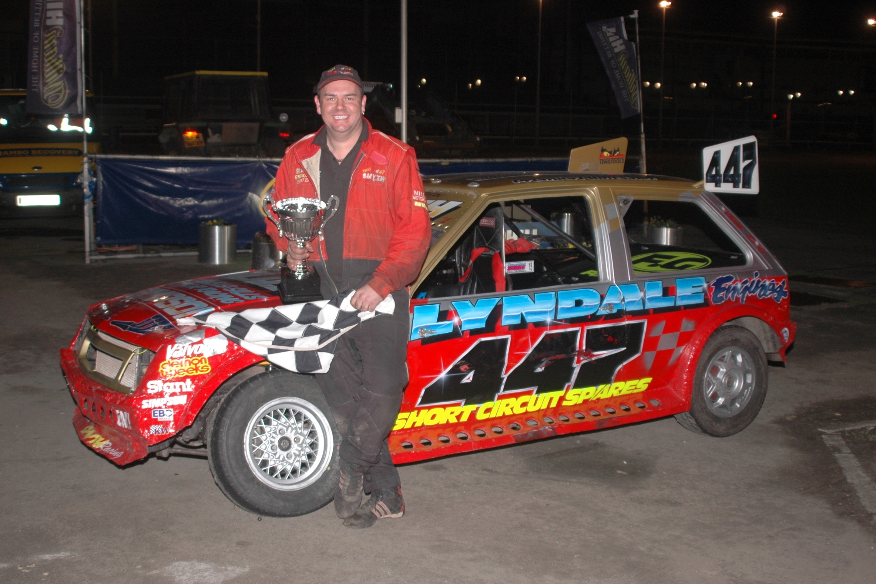 Following his top 4 finished in both heats; it was the World Champion's 447 Vauxhall Nova that took pole position for the London Championship Final which featured a spectacular rollover for 417 Helen Blackman - whose new sparkling blue roof certainly looked a little second hand afterwards! Helen climbed out of the car unhurt and we hope it won't be too long before we see her back on track. Stuart Smyth made a good restart from the front and held on to his lead until the chequered flag to regain the London Championship. Andy Sturt 168 finished second on track but fell foul of the steward's eagle eye and was docked two places for contact - elevating Heat One Winner Ricky Glendening 747 to second place and 251 Lee Ribbans to third.