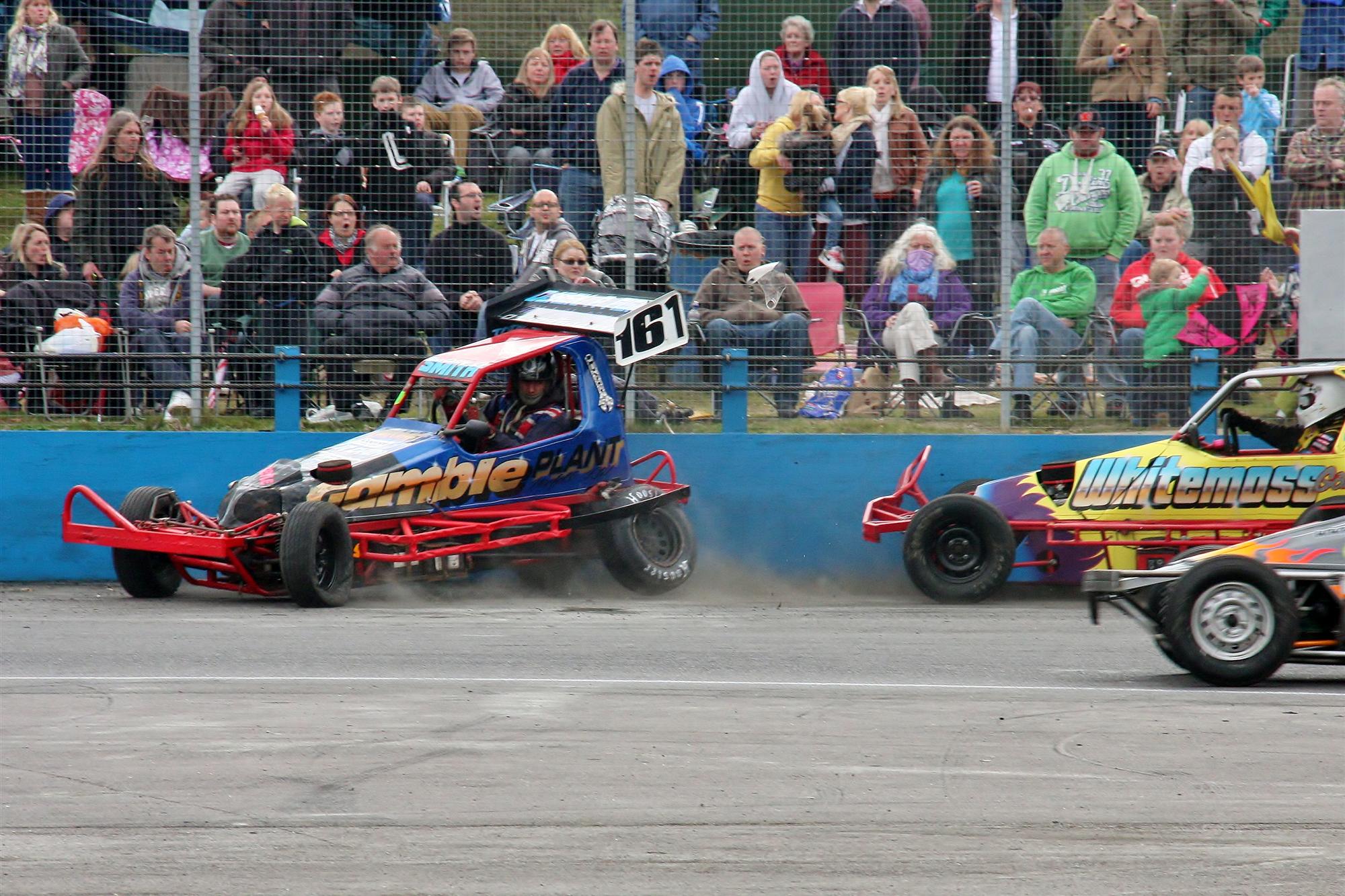 Following the main race there were 3 split heats for the Superstox. Following their clash at the British Championship weekend last year at Lochgelly the almost inevitable clash between 177 Gilchrist and 161 Smith happened in the first of these heats when 177 battered 161 into the fence on the turnstile bend - a hard enough hit for the Steward to load Gilchrist for the day. With the scores possibly being perceived as 1-1 in their personal battle - who will gain the advantage the next time these two drivers meet?