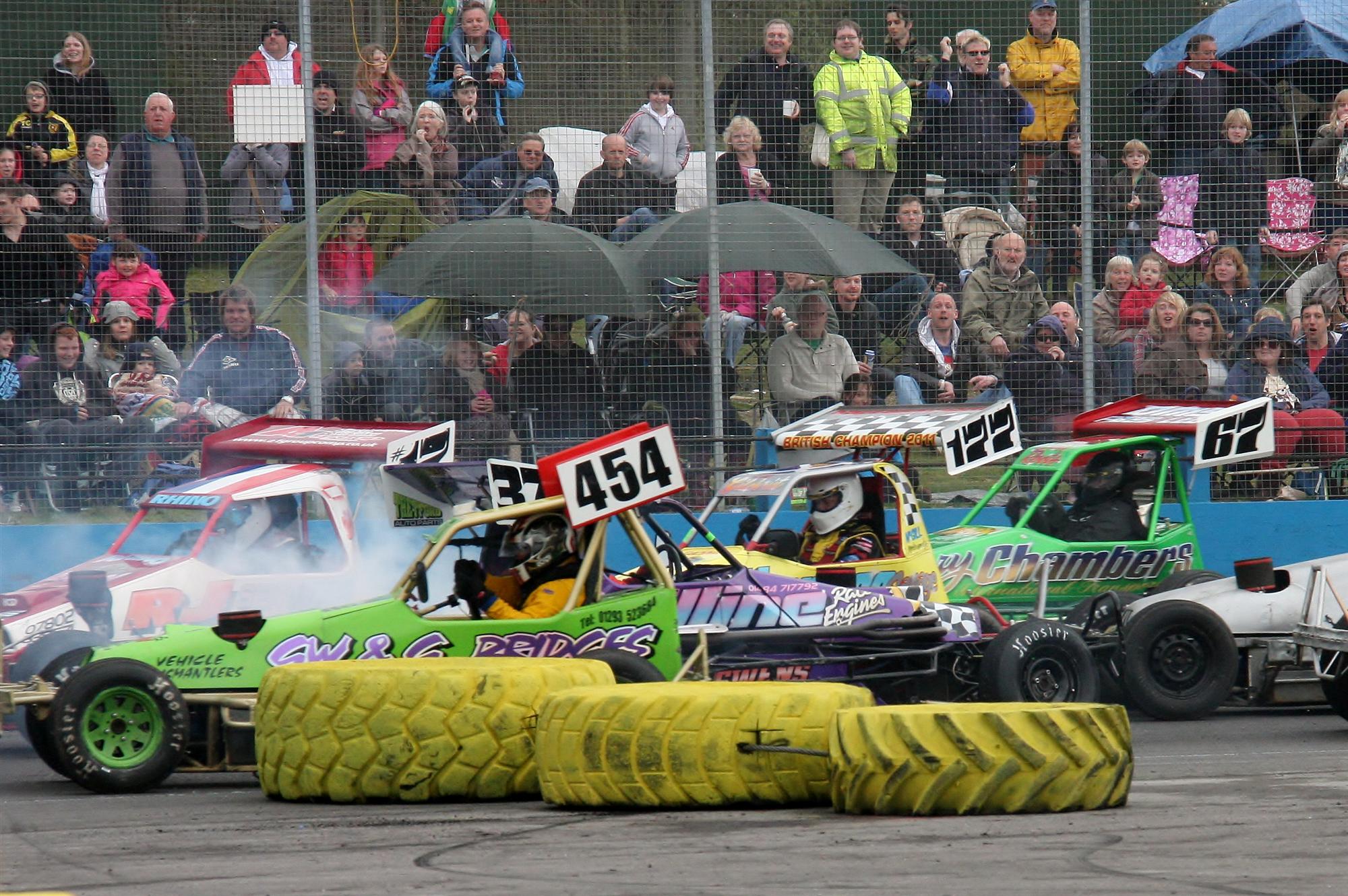 As the cars entered the arena, the drivers were perched on the back of their steeds to choose their grid position by way of a random draw. It was pleasing to see 3 Scottish drivers make the long trip south and these included 35 Chris Stewart, 100 George MacMillan Jnr and the defending champion 177 Stuart Gilchrist. The 28 entrants all received a warm welcome as they circulated the track as part of a grand parade from the large crowd at the Claycart Road venue.